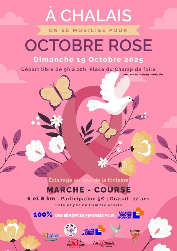 Dans le cadre d’Octobre rose, la commune de Chalais et ses partenaires organisent une marche / course pour soutenir la lutte contre le cancer du sein.