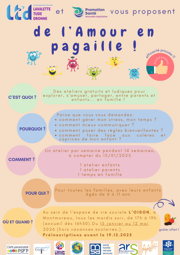 Dans le cadre du soutien aux familles et à la parentalité, la Communauté de communes et Promotion santé, en partenariat avec l’équipe d’animation de l’espace de vie sociale L’OISON et du Centre socioculturel ENVOL, proposent un programme d’accompagnement original, où parents et enfants participent ensemble à des ateliers !